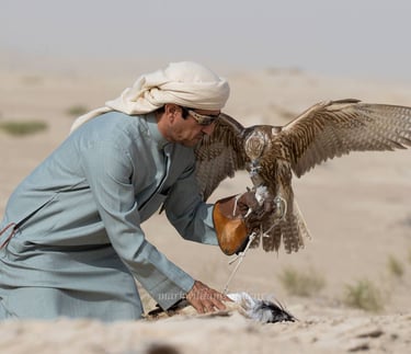 The initial stage of taming the falcon is always going to be difficult because the freshly trapped falcon behaves aggressively and hisses a very great deal. The manning process is to introduce the falcon to the artificial environment it is now placed in and to overcome its fear of man. My own practice is to approach the training slowly and steadily taking great care over introducing the falcon to its new environment. I learnt that from Arabic falconers. They spend more time in handling the falcon, introducing human environment, with the falconer always taking care. The falcon will man down in a surprisingly short time, overcoming its fear of man.
