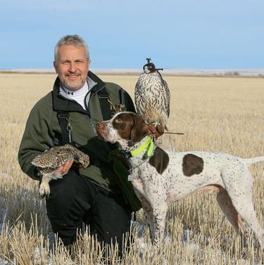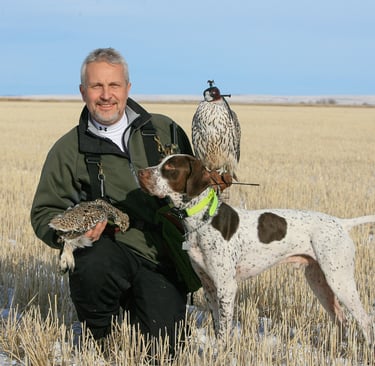 Picture 2. North American master falconer Mark Williams on his succesful sharptail hunting with gyrfalcon