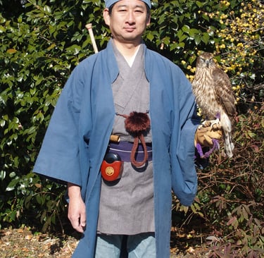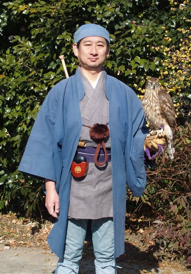 Picture 1. Dressed as traditionally Japanese falconer Mr Keiya Nakajima with his Goshawk.