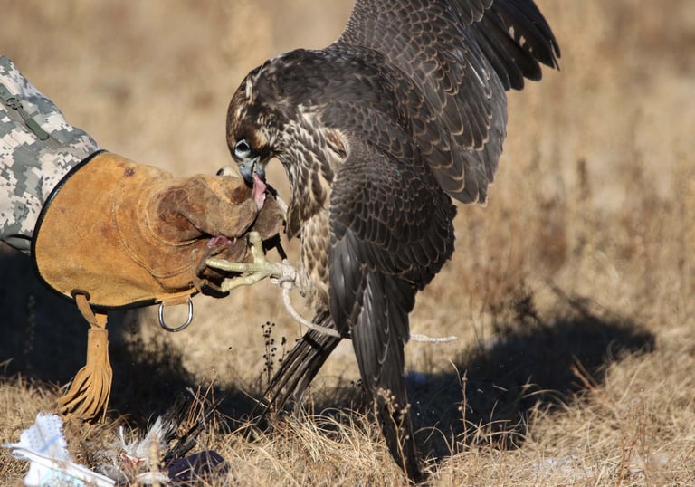 Training methods depend on a different form falconry, but they follow the generally accepted way. First of all the method depends if the bird is an imprint or wild trapped. All falconers use wild falcons in In Mongolia, because the practice is conducive in continental weather condition and high mountainous region. I would prefer to fly immature falcons, especially in the second calendar year which is a perfect hunter and is easy to teach. Basic method of training on the wild falcon is to make the relationship between falcon and falconer. Of course, making direct communication with a wild falcon is not easy and can be complicated, this is because all raptors are principally solitarily and territorial animals. A fresh trapped falcon from the wild will need to handled cautiously and carefully. A falcon taken from wild, if it learns any negative behavior is then complicated to train in the future. For example, the falcon not coming to sit on a gloved fist with meat, should not be depending purely on weight control.